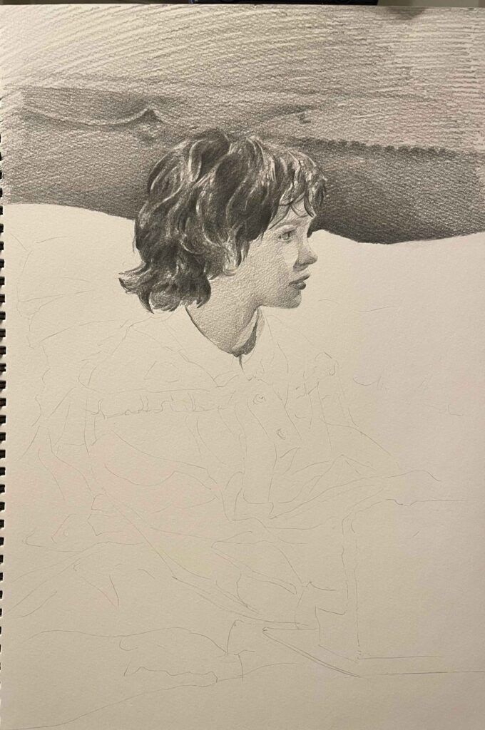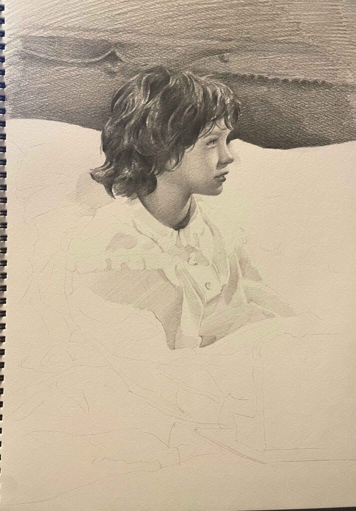 今回意識したのは髪の毛の質感や立体感、白い洋服の質感や構造、顔を繊細な変化、全体の明度のデザイン的バランスです。このような絵を描くのは一見難しそうですが、しっかりとコツとポイントを抑えれば皆さん描けるようになります。AZUMAs美術学院の目標はみんながデッサンの達人になることです。