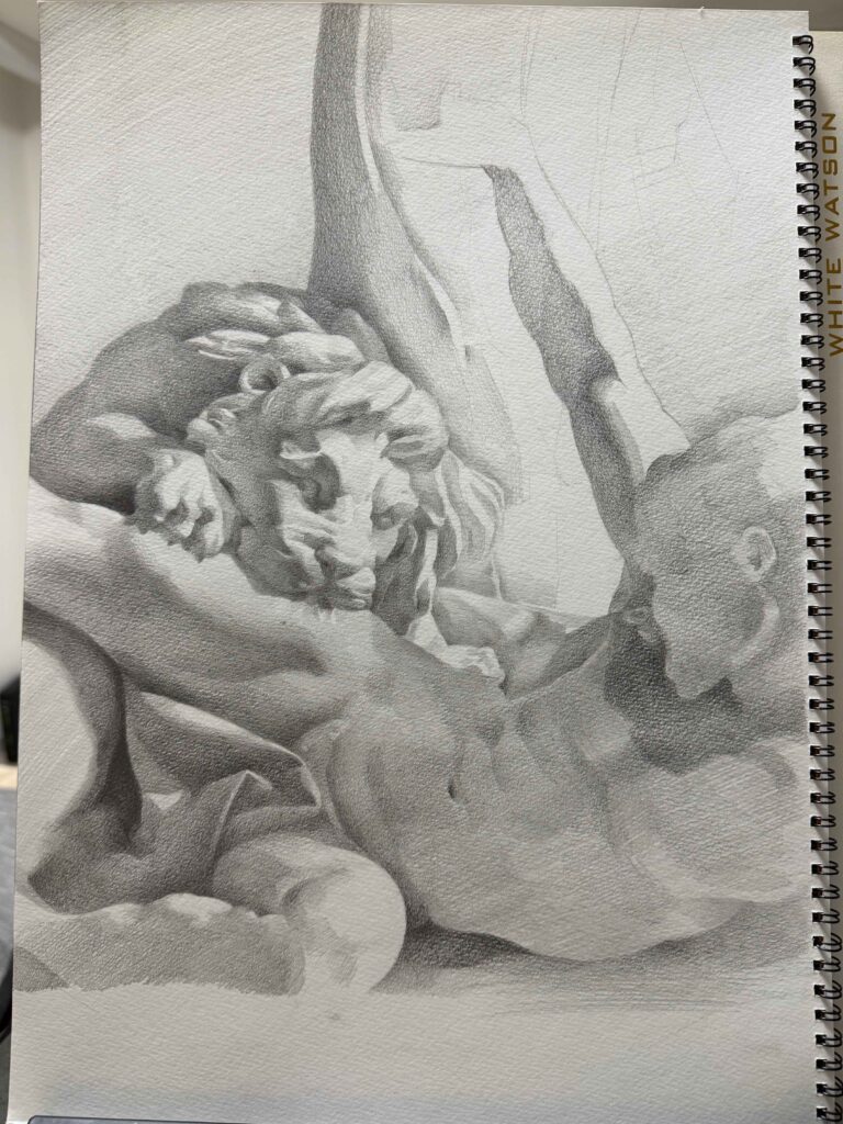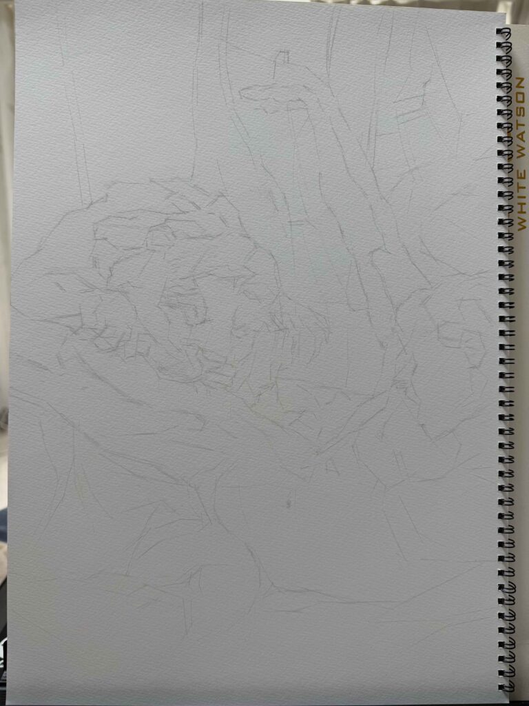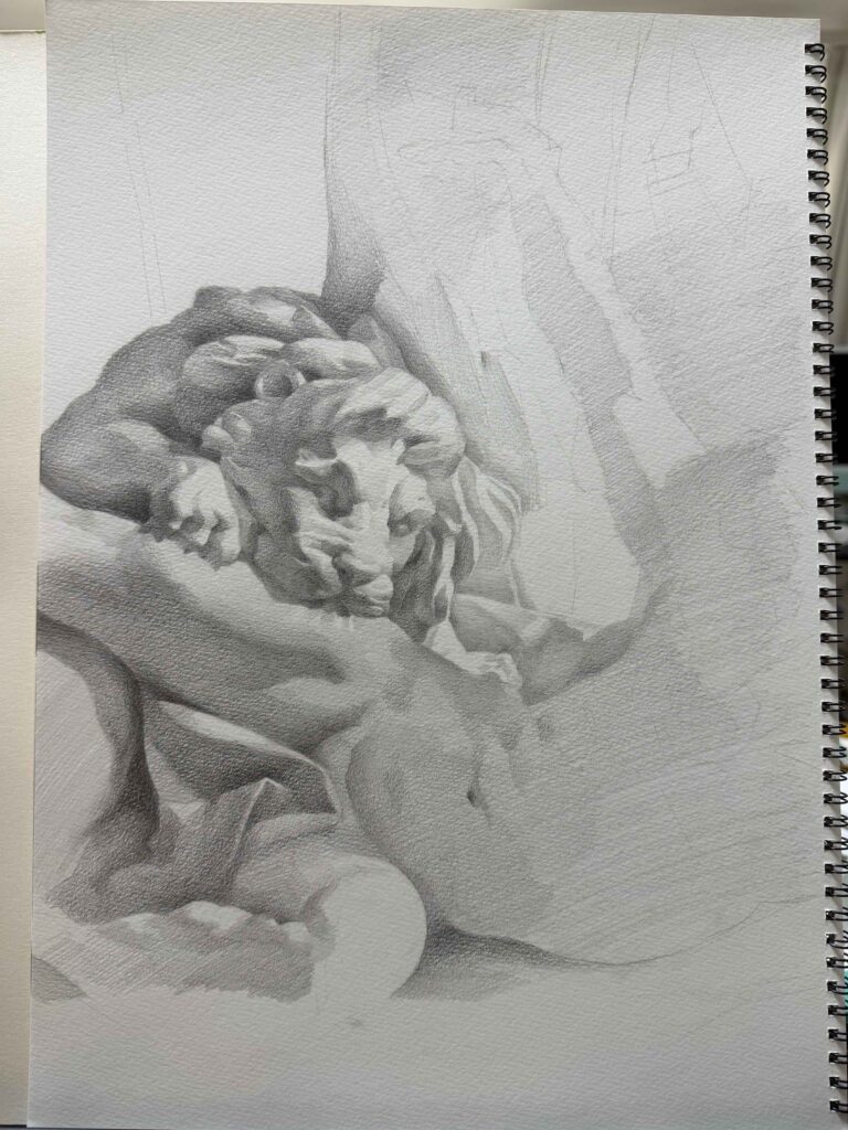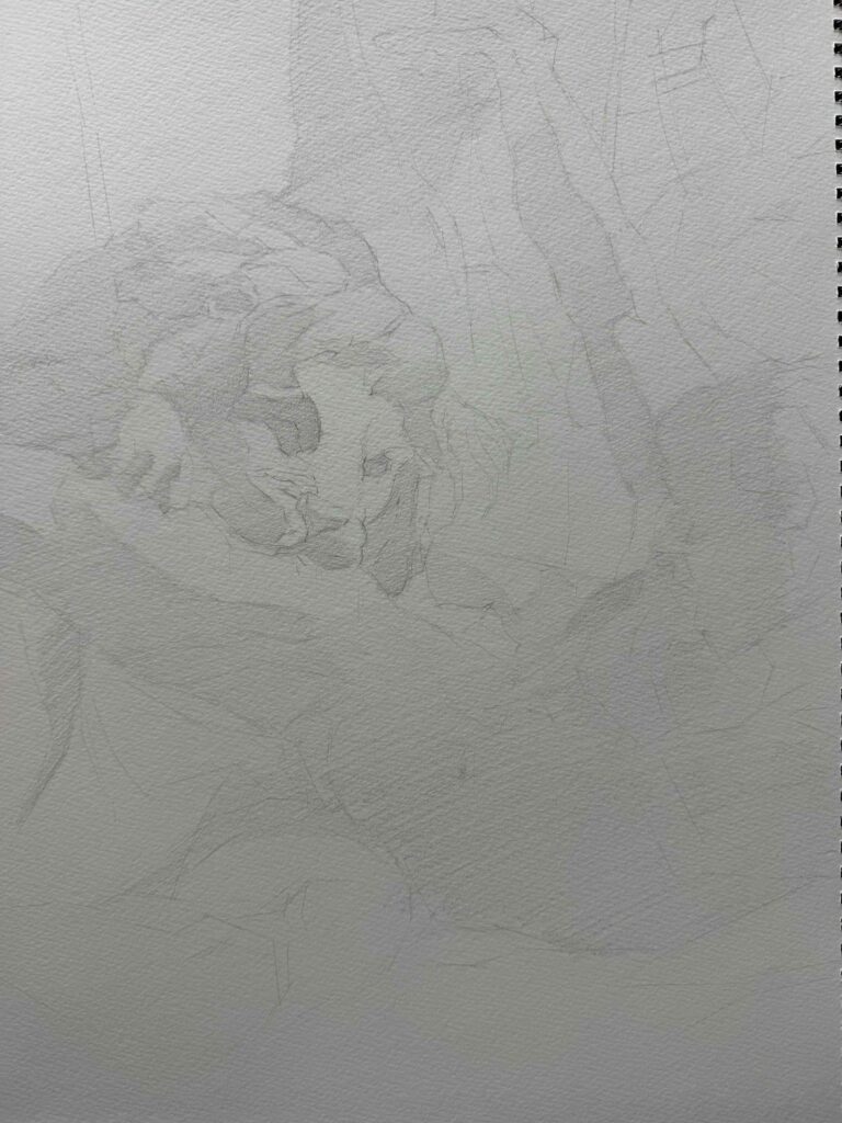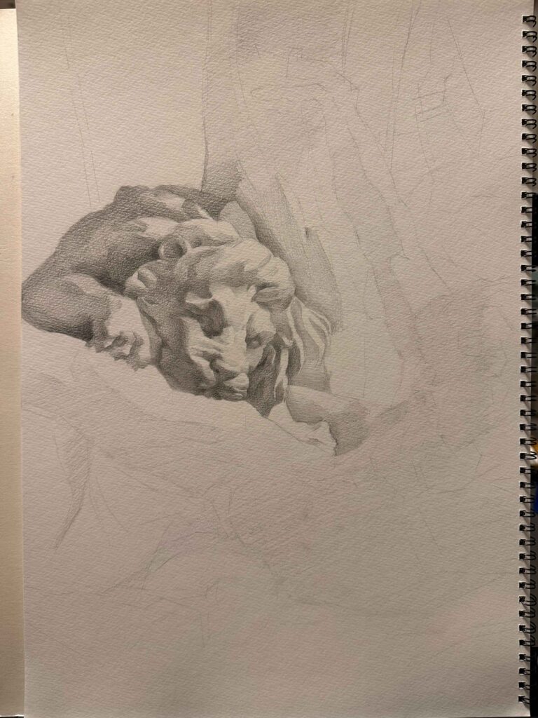 ライオン像の顔から取りかかりました。いちばんメインとなるところから描き始めるのはおすすめです。