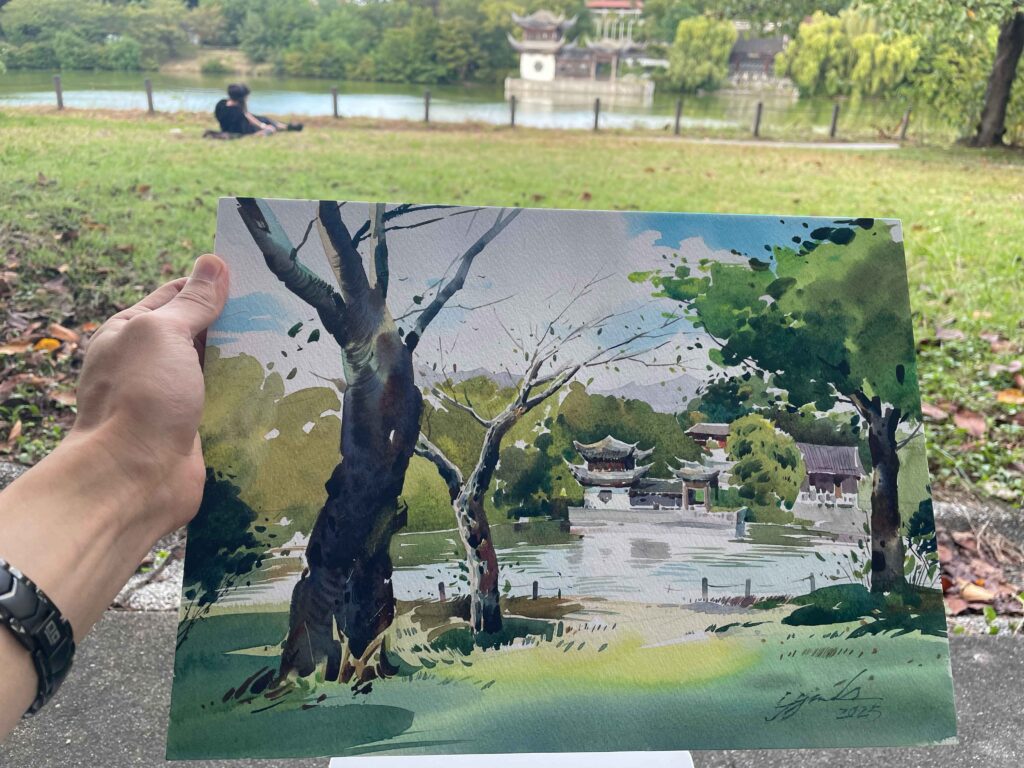 写生の魅力は、遠くの木を手前に持ってきたり、影を付け足したりと、自分で自由に画面構成しながら物語を作り上げられるところにあります。
